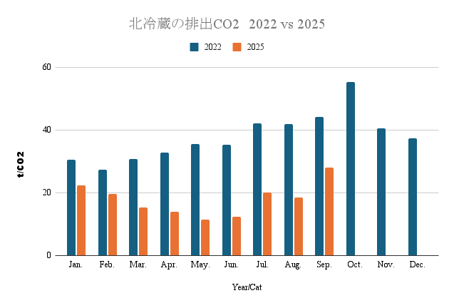 夏季は冷蔵倉庫における電力使用が最も多くなる時期ですが、今年は前年同月比で半分以下の排出量に抑えることができました。これは当社の省エネ対策が安定して成果を上げていることを示しています。2022では7月から40トンを超えるCO2の排出がありましたが、同時期の2025では約20トン平均の排出量で留まりました。