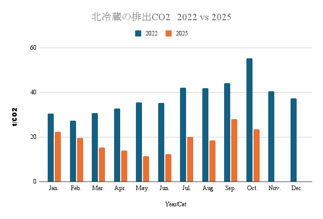 北冷蔵では、2022年を排出量の基準年と定め、冷蔵設備や電力の改善を中心とした対策を実行してまいりました。